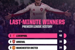 英超历史90分钟后绝杀进球榜:利物浦48球居首,阿森纳次席
