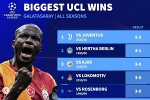 体育资讯2月18日讯 欧冠1/8决赛附加赛首回合,加拉塔萨雷5-2大胜尤文,根据德转统计,本场比赛是加拉塔萨雷的欧冠联赛最大比分胜利。